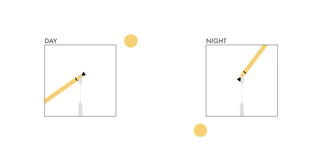 日回は、緯度・経度・時刻・方角をもとに、太陽の方位と高度を算出し、太陽が照らすのと同じ方向に光を放ちます。